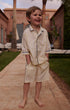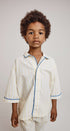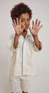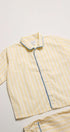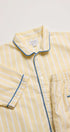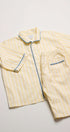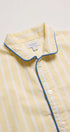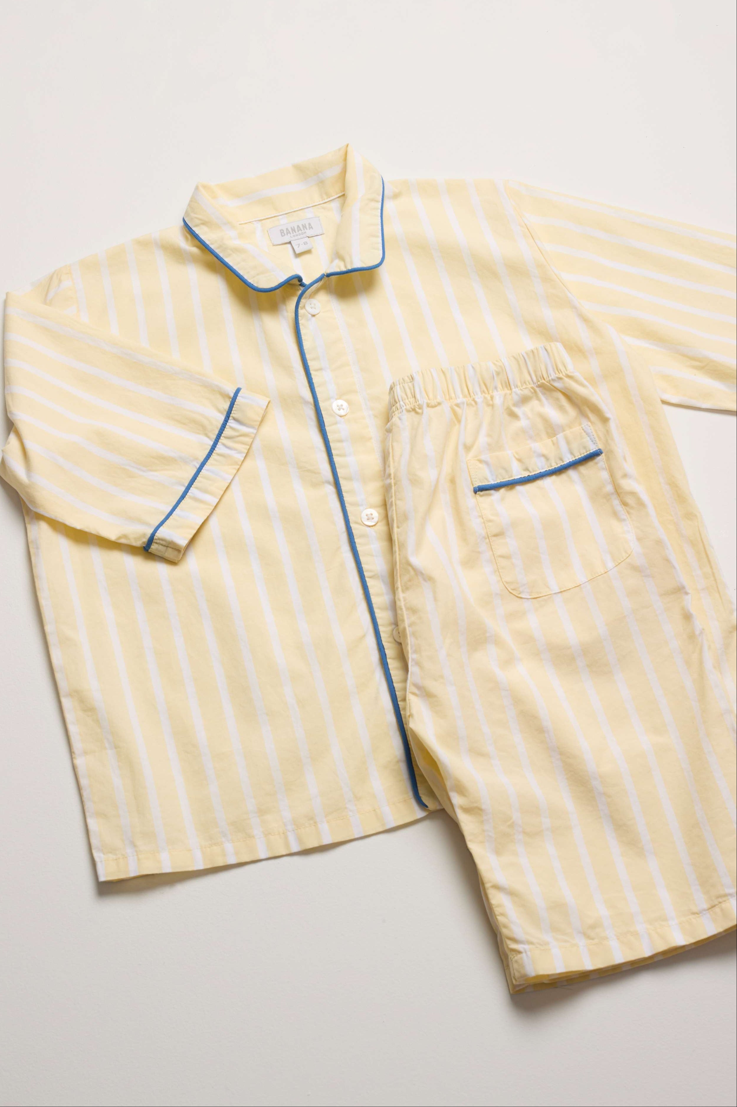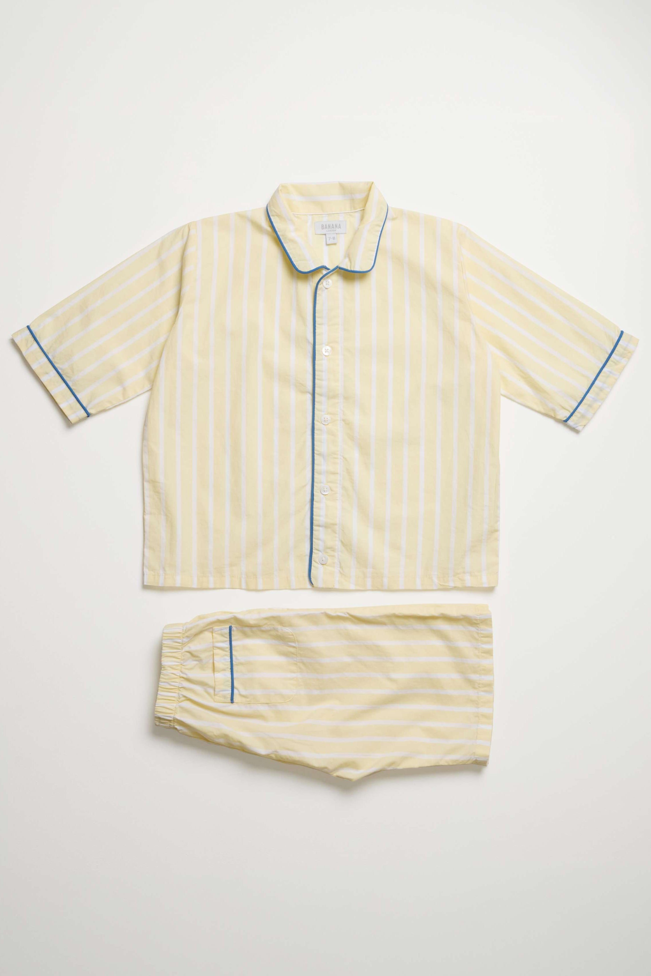 These buttery yellow stripe pyjamas are perfect for warm summer evenings, offering light, breathable comfort. The soft cotton poplin fabric keeps children cool while they sleep, with a classic design finished with an elegant blue contrast piping and a Peter Pan collar.